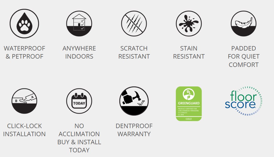 · Waterproof luxury vinyl flooring features a patented click-lock installation system that is easy to install without the need for glue or nails and goes over most existing flooring.